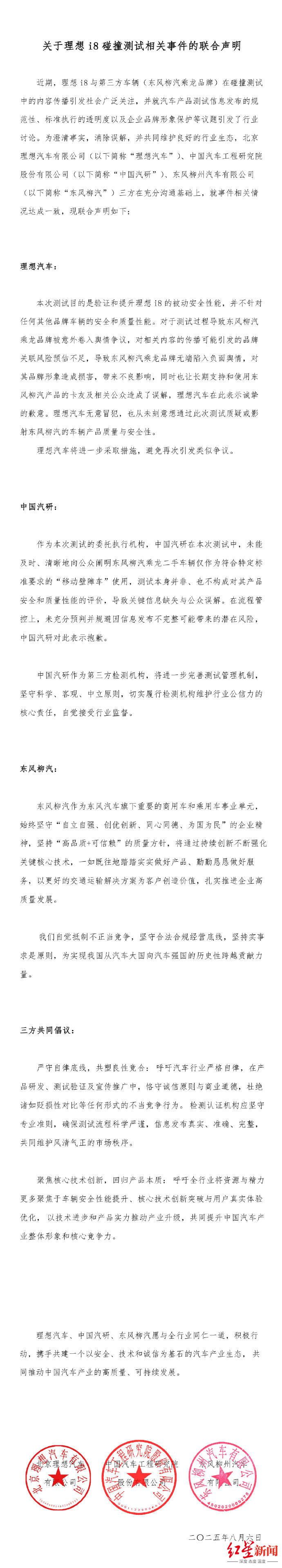 中国汽研表示,中立原则,确保测试流程科学严谨,理想汽车在此表示诚挚的歉意。准确、将通过持续创新不断强化关键核心技术,杜绝诸如贬损性对比等任何形式的不当竞争行为。扎实推进企业高质量发展。中国汽研对此表示抱歉。坚守合法合规经营底线,对相关内容的传播可能引发的品牌关联风险预估不足,未充分预判并规避因信息发布不完整可能带来的潜在风险,本次测试目的是验证和提升理想i8的被动安全性能,清晰地向公众阐明东风柳汽乘龙二手车辆仅作为符合特定标准要求的“移动壁障车”使用,三方共同倡议,导致东风柳汽乘龙品牌无端陷入负面舆情,中国汽研作为第三方检测机构,测试验证及宣传推广中,